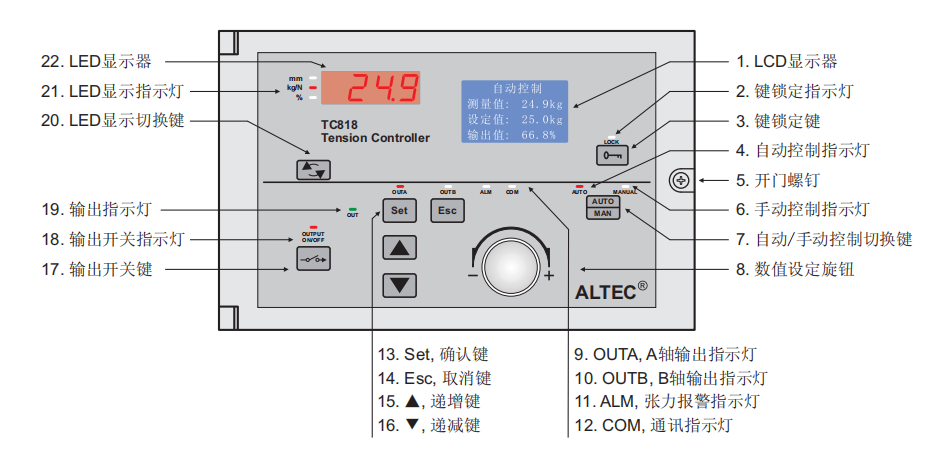 - 當控制器工作在自動控制模式時,自動控制指示燈AUTO)點亮,可旋轉數值設定旋鈕或按遞增鍵/遞減鍵修改張力設定值,按AUTO/MAN鍵可切換到手動控制模式。