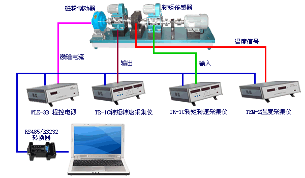 1. 傳動機械測量系統通過2臺相位差式轉矩轉速傳感器及2臺TR-1C轉矩轉速采集儀采集變速箱的輸入(輸出)轉矩和轉速;用1臺TEM-2溫度采集儀采集溫升;用WLK-3B程控電源控制磁粉制動器對變速箱進行加載。