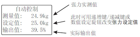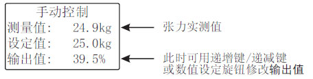 當控制器工作在自動控制模式時,自動控制指示燈(AUTO)點亮,可旋轉(zhuǎn)數(shù)值設定旋鈕或按遞增鍵/遞減鍵修改張力設定值,按AUTO/MAN鍵可切換到手動控制模式。